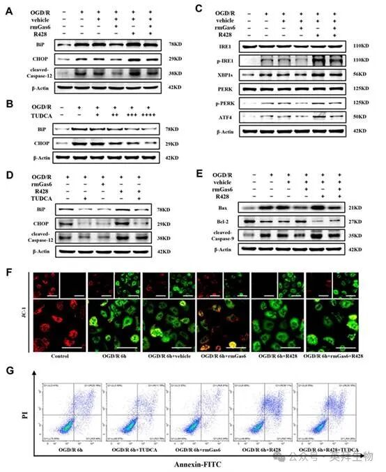 與圖 3 所示的體內(nèi)實(shí)驗(yàn)一致,OGD/R 誘導(dǎo)的 ER 應(yīng)激導(dǎo)致終末 UPR 信號(hào)(如 BiP、CHOP 和 Caspase-12)反應(yīng),而 rmGas6 在體外的預(yù)處理可減輕這種反應(yīng)(圖 4A)。熊去氧膽酸(TUDCA)是一種公認(rèn)的ER應(yīng)激抑制劑,它能以劑量依賴的方式充分阻斷OGD/R處理的肝細(xì)胞中的ER應(yīng)激反應(yīng)(圖4B)。正如預(yù)期的那樣,用 rmGas6 激活的 AXL 能顯著抑制體外經(jīng) OGD/R 處理的原代肝細(xì)胞中 p-IRE1、XBP1s、p-PERK 和 ATF4 的水平(圖 4C)。用 rmGas6 預(yù)處理的效果與 TUDCA 相似,而且 TUDCA 的應(yīng)用逆轉(zhuǎn)了 R428 的有害影響(圖 4D)。此外,rmGas6預(yù)處理通過降低體外OGD/R誘導(dǎo)的線粒體相關(guān)肝細(xì)胞凋亡中裂解的Caspase-9和Bax的表達(dá),同時(shí)提高Bcl-2的水平,阻礙了OGD/R誘導(dǎo)的線粒體相關(guān)肝細(xì)胞凋亡(圖4E)。此外,原代肝細(xì)胞中 JC-1 的免疫熒光染色也表明 OGD/R 期間線粒體膜電位(MMP)降低,表現(xiàn)為 JC-1 聚集體(紅色熒光)減少,JC-1 單體(綠色熒光)增加。值得注意的是,rmGas6 預(yù)處理可恢復(fù) MMP,這也表明活化的 AXL 可減輕肝 I/R 損傷期間線粒體相關(guān)的細(xì)胞凋亡(圖 4F)。此外,流式細(xì)胞術(shù)檢測(cè)證實(shí),rmGas6 和 TUDCA 預(yù)處理均可減少 OGD/R 誘導(dǎo)的線粒體凋亡(圖 4F)。此外,流式細(xì)胞術(shù)檢測(cè)證實(shí),rmGas6 和 TUDCA 預(yù)處理均可減少 OGD/R 誘導(dǎo)的細(xì)胞凋亡(圖 4G)。這些結(jié)果進(jìn)一步驗(yàn)證 p-AXL 在原代肝細(xì)胞 OGD/R 過程中抑制 ER 應(yīng)激和線粒體相關(guān)的細(xì)胞凋亡。