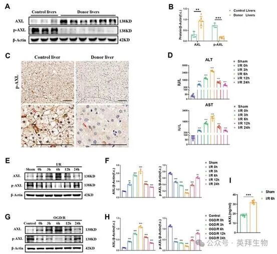 為了研究總AXL/p-AXL在手術(shù)缺血條件下是否失調(diào),以及它們是否參與了人類肝臟I/R損傷,檢測(cè)它們?cè)诠w移植物肝臟活檢組織和對(duì)照組中的表達(dá)情況。結(jié)果顯示,供體肝臟中總 AXL 的表達(dá)水平高于對(duì)照組,而 p-AXL 的表達(dá)趨勢(shì)則相反(圖 1A-C)。為了探討肝臟 I/R 期間總 AXL/p-AXL 的變化趨勢(shì),我們構(gòu)建了缺血 60 分鐘后不同再灌注時(shí)間的小鼠模型。小鼠血清中的肝酶(ALT/AST)水平在I/R損傷后6小時(shí)前逐漸升高,之后隨著時(shí)間的推移逐漸恢復(fù)(圖1D)。同樣,AXL的總表達(dá)也在6小時(shí)達(dá)到峰值,然后逐漸恢復(fù)到基礎(chǔ)水平。在此過程中,p-AXL 的表達(dá)在 6 h 時(shí)最低(圖 1E&F)。同時(shí),我們?cè)隗w外對(duì)原代肝細(xì)胞進(jìn)行 OGD/R 處理,總 AXL/p-AXL 的表達(dá)與小鼠肝 I/R 期間觀察到的趨勢(shì)相同(圖 1G&H)。令人印象深刻的是,檢測(cè)肝臟 I/R 小鼠血清中的可溶性 AXL(sAXL)發(fā)現(xiàn) sAXL 大大升高??扇苄?span> AXL 是總 AXL 的裂解產(chǎn)物,沒有生理活性,但可以競(jìng)爭(zhēng)性阻斷 AXL 受體。這一結(jié)果為肝臟 I/R 期間總 AXL 的增加和 p-AXL 的減少提供了解釋(圖 1I)。因此,在肝臟 I/R 期間,AXL 的磷酸化會(huì)減少。