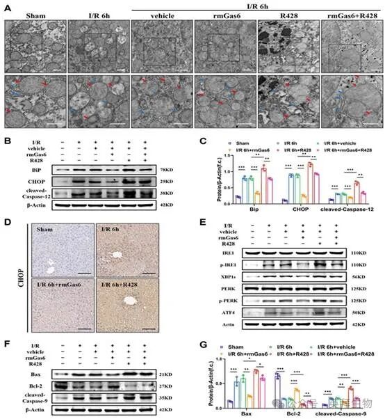 為進(jìn)一步研究AXL是否會(huì)影響肝臟I/R過程中的ER,用TEM檢測(cè)肝組織的超微結(jié)構(gòu)。發(fā)現(xiàn)ER 在 I/R 后出現(xiàn)異常,擴(kuò)張、空泡化和片狀折疊管狀結(jié)構(gòu)消失。rmGas6預(yù)處理組的損傷得到緩解,ER結(jié)構(gòu)相對(duì)完整,而R428則加劇IR誘導(dǎo)的損傷(圖3A)。Western 印跡結(jié)果顯示,BiP、CHOP 和裂解的 Caspase-12(Caspase-12 的活性形式)水平上調(diào),這表明肝 I/R 導(dǎo)致 ER 應(yīng)激及其相關(guān)的細(xì)胞凋亡。然而,rmGas6預(yù)處理逆轉(zhuǎn)了這些影響,R428預(yù)處理加重IR誘導(dǎo)的過度ER應(yīng)激和細(xì)胞凋亡(圖3B&C)。肝組織 CHOP 染色免疫組化也表明,rmGas6 預(yù)處理可抑制 CHOP 上調(diào),從而減輕肝損傷(圖 3D)。在真核細(xì)胞中,有三種ER跨膜蛋白介導(dǎo)典型的UPR:兩種激酶IRE1和PERK,以及轉(zhuǎn)錄因子前體ATF6。至于細(xì)胞凋亡效應(yīng),前兩個(gè)激酶 IRE1 和 PERK 主要參與其中。Western 印跡分析發(fā)現(xiàn),肝臟 I/R 使磷酸化-IRE1(p-IRE1,IRE1 的活性形式)及其下游效應(yīng)物 XBP1s、磷酸化-PERK(p-PERK,PERK 的活性形式)及其下游 ATF4 水平升高,而 rmGas6 預(yù)處理可逆轉(zhuǎn)所有這些趨勢(shì)(圖 3E)。因此,這些研究結(jié)果表明,活化的AXL可抑制ER應(yīng)激中UPR的IRE1和PERK分支,從而保護(hù)肝臟免受I/R損傷。值得注意的是,TEM 觀察到的超微結(jié)構(gòu)變化也表明 I/R 后線粒體腫脹和嵴模糊,而活化的 AXL 也能顯著恢復(fù)線粒體的超微結(jié)構(gòu)(圖 3A)。作為內(nèi)源性凋亡的經(jīng)典途徑,作者還研究了 p-AXL 是否在線粒體相關(guān)凋亡中發(fā)揮作用。結(jié)果顯示,在小鼠肝臟 I/R 損傷過程中,活化的 AXL 可抑制裂解的 Caspase-9(Caspase-9 的活性形式)和 Bax 的水平,同時(shí)增加 Bcl-2 的表達(dá)(圖 3F&G)。所有這些都證實(shí),激活AXL可減輕肝臟I/R損傷過程中的ER應(yīng)激和線粒體相關(guān)的細(xì)胞凋亡。