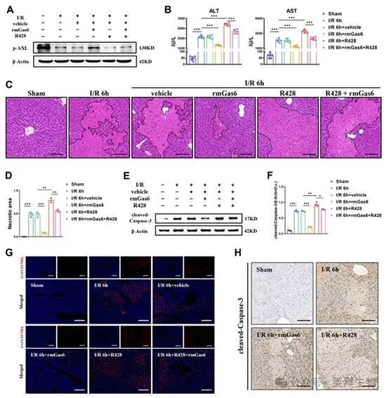 為探討AXL抑制是否會(huì)導(dǎo)致I/R損傷及其詳細(xì)機(jī)制,使用外源性rmGas6腹腔注射激活AXL。與人體樣本的研究結(jié)果一致,肝臟 I/R 小鼠體內(nèi) p-AXL 的表達(dá)量減少。當(dāng)用rmGas6激活AXL時(shí),p-AXL水平的升高表明AXL被激活了(圖2A)。與假手術(shù)組相比,肝I/R損傷導(dǎo)致肝損傷和血清中ALT和AST水平升高,而注射rmGas6可逆轉(zhuǎn)這些影響。同樣,AXL 的特異性抑制劑 R428 會(huì)顯著加劇肝壞死面積以及 ALT 和 AST 血清水平的升高(圖 2B-D)。此外,肝臟 I/R 小鼠體內(nèi)促凋亡蛋白裂解的 Caspase-3(Caspase-3 的活性形式)水平升高,而使用 rmGas6 預(yù)處理可逆轉(zhuǎn)這些趨勢(shì)。肝組織切片的TUNEL檢測(cè)和裂解的Caspase-3免疫組化染色也證實(shí),活化的AXL通過抑制體內(nèi)細(xì)胞凋亡保護(hù)肝臟免受I/R損傷(圖2E-H)。這些數(shù)據(jù)表明,激活 AXL 可通過抑制細(xì)胞凋亡保護(hù)肝臟免受 I/R 損傷。