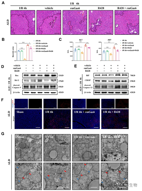 如上所述,ALD 小鼠因ER 應(yīng)激和線粒體相關(guān)凋亡而遭受更嚴(yán)重的肝臟 I/R 損傷。接下來研究活化的 AXL 對(duì) ALD 小鼠的 I/R 損傷是否也有保護(hù)作用。rmGas6預(yù)處理可減輕紅外誘導(dǎo)的肝損傷,這表現(xiàn)在壞死面積減少(圖 6A&B)和血清轉(zhuǎn)氨酶水平(ALT/AST)降低(圖 6C)。此外,用 rmGas6 預(yù)處理可減輕 ALD 小鼠肝臟 I/R 損傷過程中線粒體相關(guān)的細(xì)胞凋亡(圖 6D),還可減少 ER 應(yīng)激相關(guān)的細(xì)胞凋亡(圖 6E)。此外,TUNEL也表明,AXL的激活減少了IR誘導(dǎo)的小鼠肝組織凋亡(圖6F)。此外,TEM直觀地顯示,rmGas6預(yù)處理有助于ER和線粒體從肝臟I/R損傷中恢復(fù)。相反,用 R428 抑制 AXL 會(huì)加劇 ER 的擴(kuò)張和細(xì)胞凋亡,從而大大加重肝臟 I/R 損傷(圖 6G)。綜上所述,這些研究為活化的AXL在ALD小鼠肝臟I/R損傷過程中抑制ER應(yīng)激和線粒體相關(guān)凋亡的保護(hù)作用提供了實(shí)驗(yàn)證據(jù)。