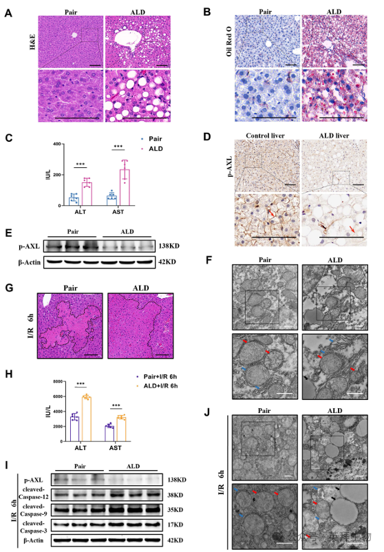 一些接受肝切除術(shù)的患者或患有ALD的供體出現(xiàn)肝切除術(shù)后肝功能衰竭的風(fēng)險(xiǎn)較高,因?yàn)檫@兩種情況都會(huì)加重I/R損傷。因此,采用慢性加暴飲暴食酒精(Gao-binge)喂養(yǎng),然后進(jìn)行I/R手術(shù)的方法來研究乙醇相關(guān)脂肪變性的肝臟I/R損傷(圖S2A)。觀察到 ALD 小鼠肝臟的宏觀變黃、腫大和龜甲紋細(xì)節(jié)(圖 S2B)。組織病理學(xué)研究顯示,與等熱量配對(duì)飼養(yǎng)的小鼠(配對(duì)組)相比,ALD 小鼠(ALD 組)出現(xiàn)了明顯的微小骨質(zhì)疏松和大骨質(zhì)疏松,以及肝細(xì)胞氣球化(圖 5A)。油紅 O 染色也證實(shí)了ALD 小鼠嚴(yán)重的肝臟脂肪變性和脂質(zhì)堆積(圖 5B)。ALD 小鼠血清中的 ALT/AST 水平也有所升高(圖 5C)。免疫組化染色顯示,在大量長(zhǎng)期飲酒導(dǎo)致的終末期肝病患者的肝臟中,p-AXL 的表達(dá)下調(diào)(圖 5D)。Western 印跡證實(shí) p-AXL 水平在 ALD 小鼠肝臟(圖 5E)中下調(diào)。此外,與配對(duì)組相比,TEM 顯示 ALD 小鼠肝臟中有脂滴、相對(duì)擴(kuò)張的 ER 管腔、腫脹的線粒體和模糊的嵴(圖 5F)。更重要的是,與配對(duì)組相比,ALD小鼠在I/R后出現(xiàn)了更嚴(yán)重的肝損傷,壞死面積更大,血清轉(zhuǎn)氨酶(ALT/AST)水平更高(圖5G&H)。此外,與Pair組相比,ALD小鼠肝臟I/R后p-AXL水平下調(diào),而裂解的Caspase-12、裂解的Caspase-9和裂解的Caspase-3的表達(dá)水平顯著上調(diào)(圖5I)。TEM顯示,與Pair組相比,ALD小鼠肝臟中的ER擴(kuò)張、線粒體腫脹和空泡變性更為嚴(yán)重(圖5J)。總之,這些研究有力地證明酒精相關(guān)肝病誘導(dǎo)ER應(yīng)激和線粒體相關(guān)凋亡,增加小鼠肝臟對(duì)I/R損傷的易感性,而p-AXL可能參與發(fā)病機(jī)制。